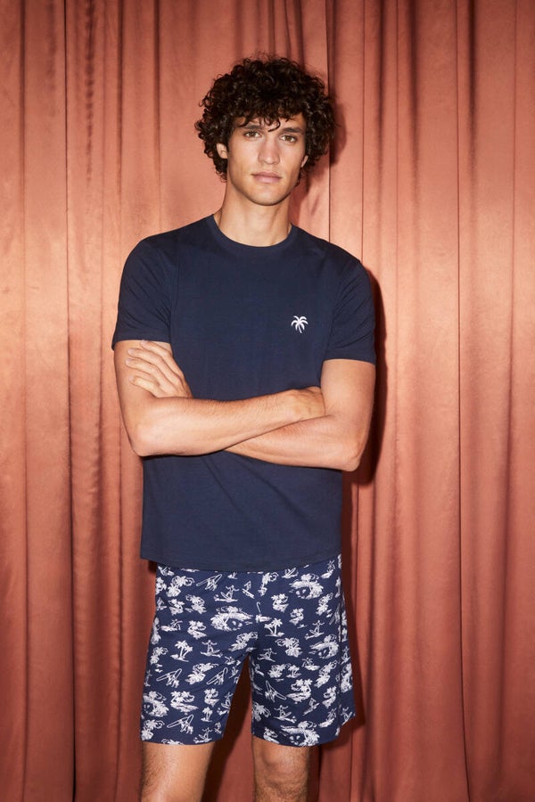- Het t-shirt heeft een v-hals, korte mouwen en een relaxte pasvorm. Kleur is donkerblauw met een wit palmboompje op de linkerborst