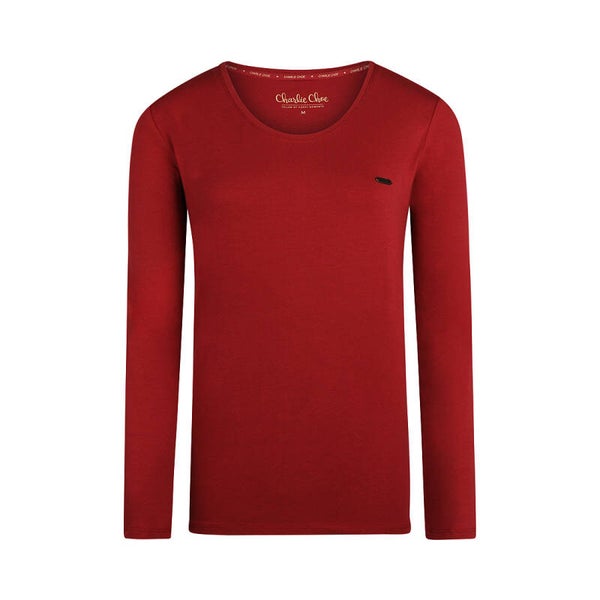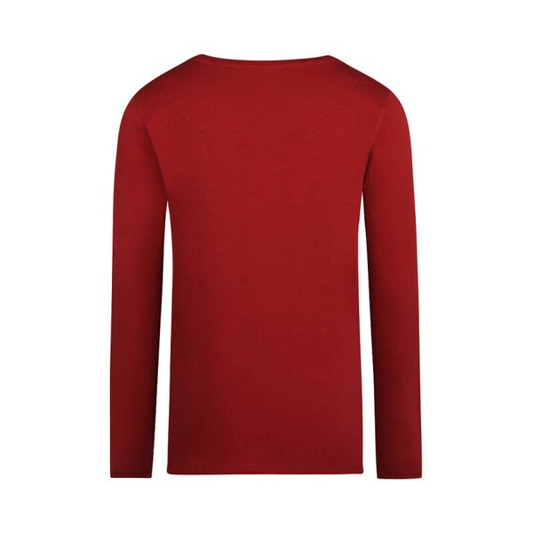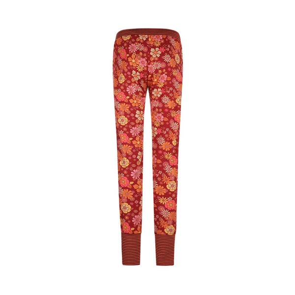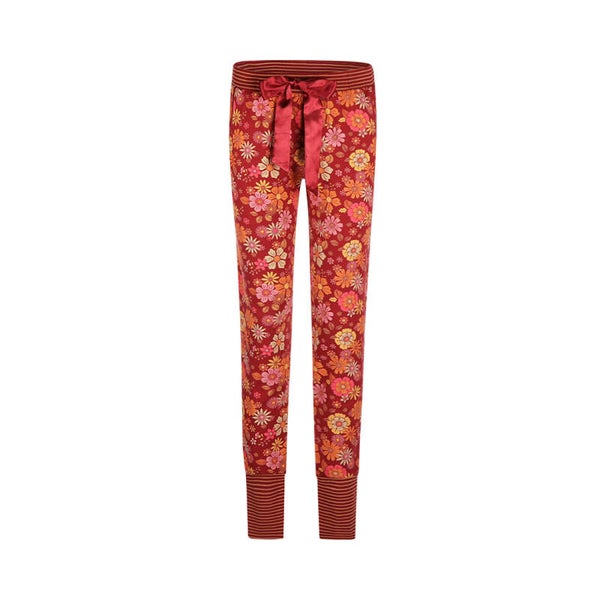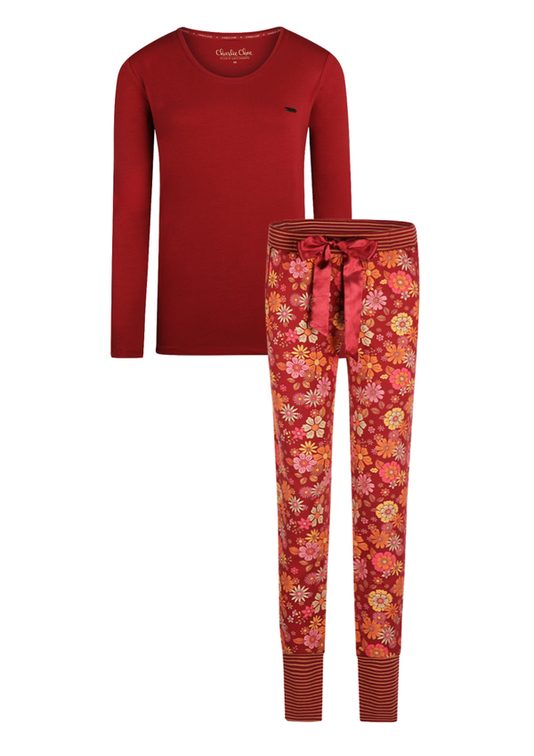 - Effen donker rode t-shirt en een all-over bloemen print broek