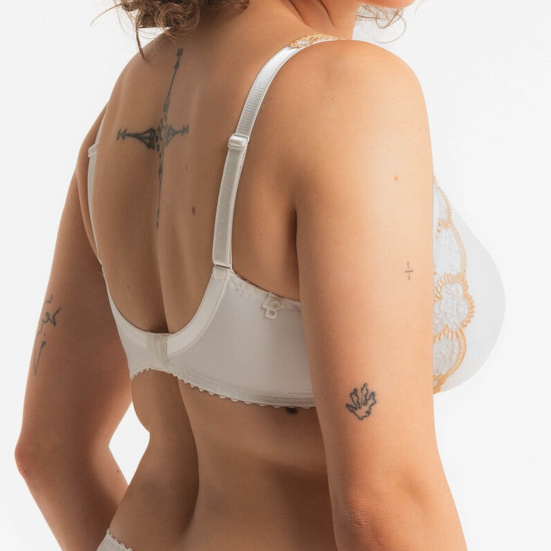 Beugel BH van Louisa Bracq uit hun basis collectie. Dit seizoen in de mooie kleur nacre; offwhite with a touch of gold. Shop de bijpassende slips onderaan de pagina!