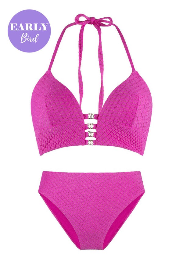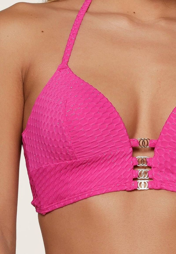 Deze triangle padded bikini voorzien van een subtiel goud lurex draadje en gouden details aan de voorzijde. Stijlvol en sprankelend