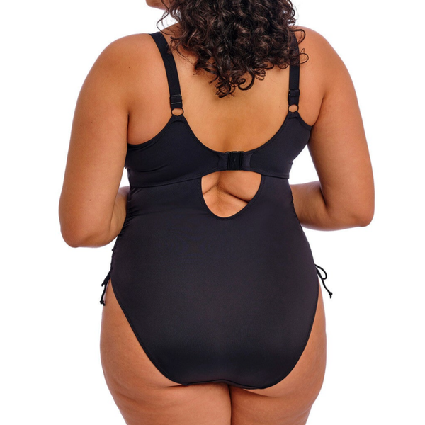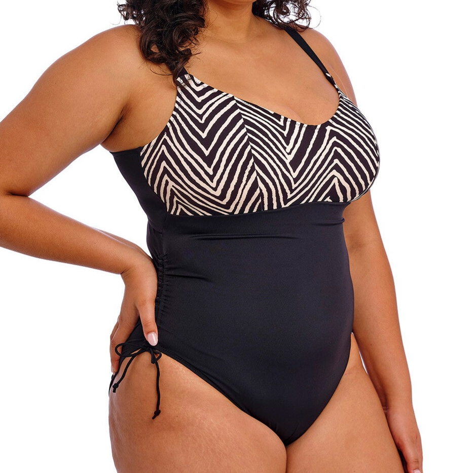 Het Elomi Fiji Falls Badpak in de kleur zwart en wit. Het badpak heeft op het borstgedeelte zebraprint en een gebogen halslijn, maar is niet heel laag uitgesneden. Op de heupen vind je verstelbare strikjes om zo de lengte op de benen aan te kunnen passen. De schouderbanden zijn ook verstelbaar. Het Elomi Fiji Falls Badpak heeft geen beugel, maar wel een verstevigde band onder de borsten en een clipsluiting aan de achterzijde voor extra steun.