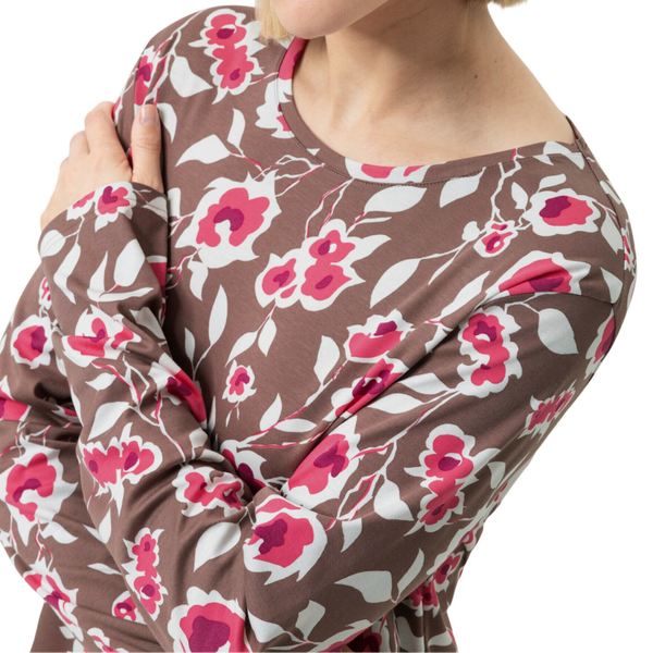 Het Mey nachthemd uit de collectie Eternal Roses is gemaakt van 100% Oeko-Tex® Standard 100-gecertificeerd katoen. Het nachthemd heeft lange mouwen en een hoge ronde hals. Met een gemiddelde lengte valt het Mey nachthemd ongeveer op de knieën. Het Mey nachthemd heeft een mooie allover bloemenprint in de kleuren roze en wit op een taupe basis kleur.