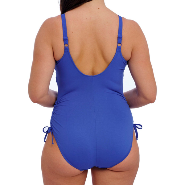 Badpak van uit de Fantasie Beach Waves collectie in een mooie felblauwe kleur. Het badpak heeft een v-hals met twist, maar valt niet heel laag. Het borst gedeelte heeft een print in de stof (jacquard). Op de heupen vind je verstelbare strikjes om zo de lengte op de benen aan te kunnen passen. De schouderbanden zijn ook verstelbaar en leuk afgewerkt met gouden details aan de voorzijde.