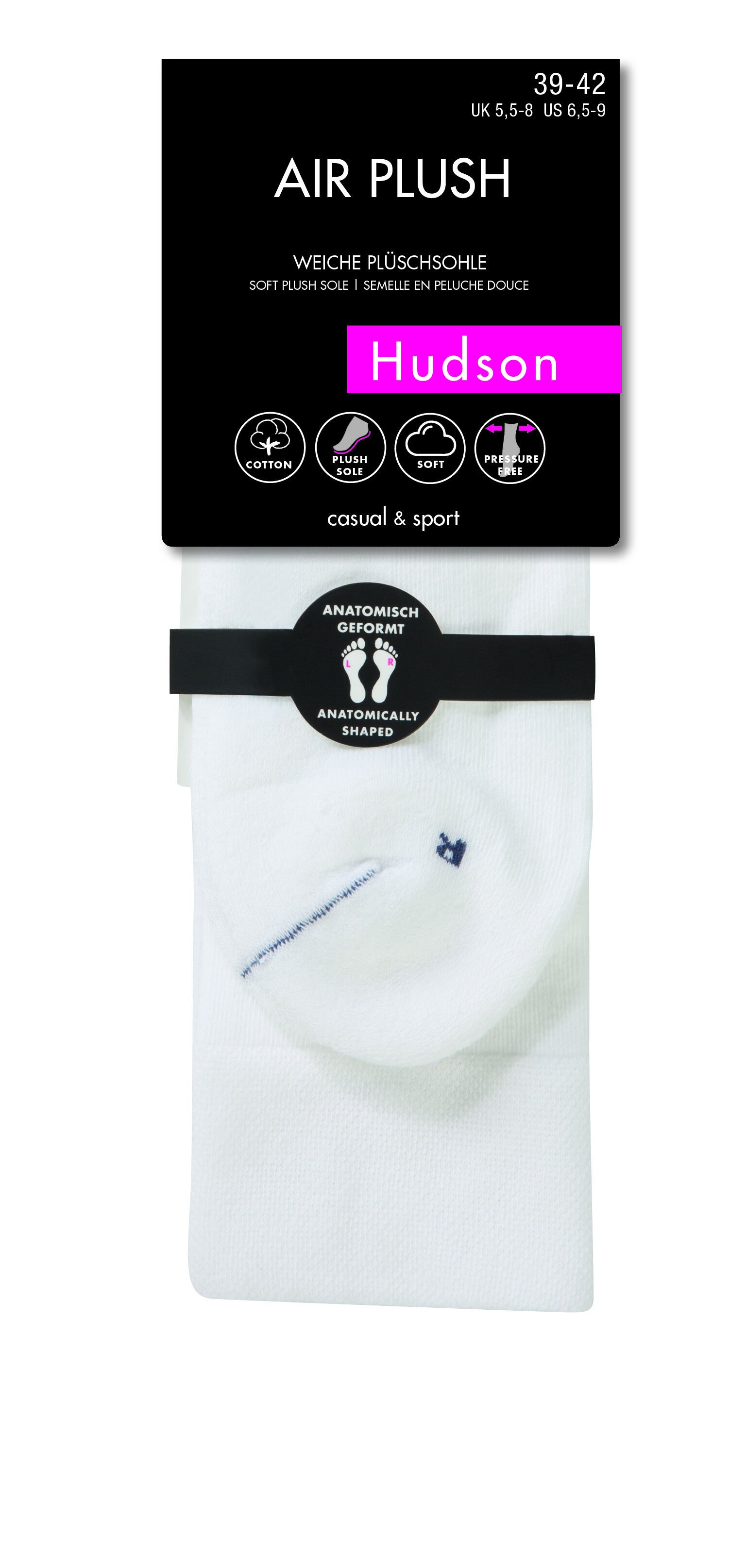 De AIR PLUSH sokken zijn gemaakt van onderhoudsvriendelijk en huidvriendelijk katoen. De comfortabele band is drukloos en de teennaad valt nauwelijks op. De superzachte pluche zool past zich perfect aan de vorm van je voet aan en heeft links en rechts markeringen en een gekleurde zoom.